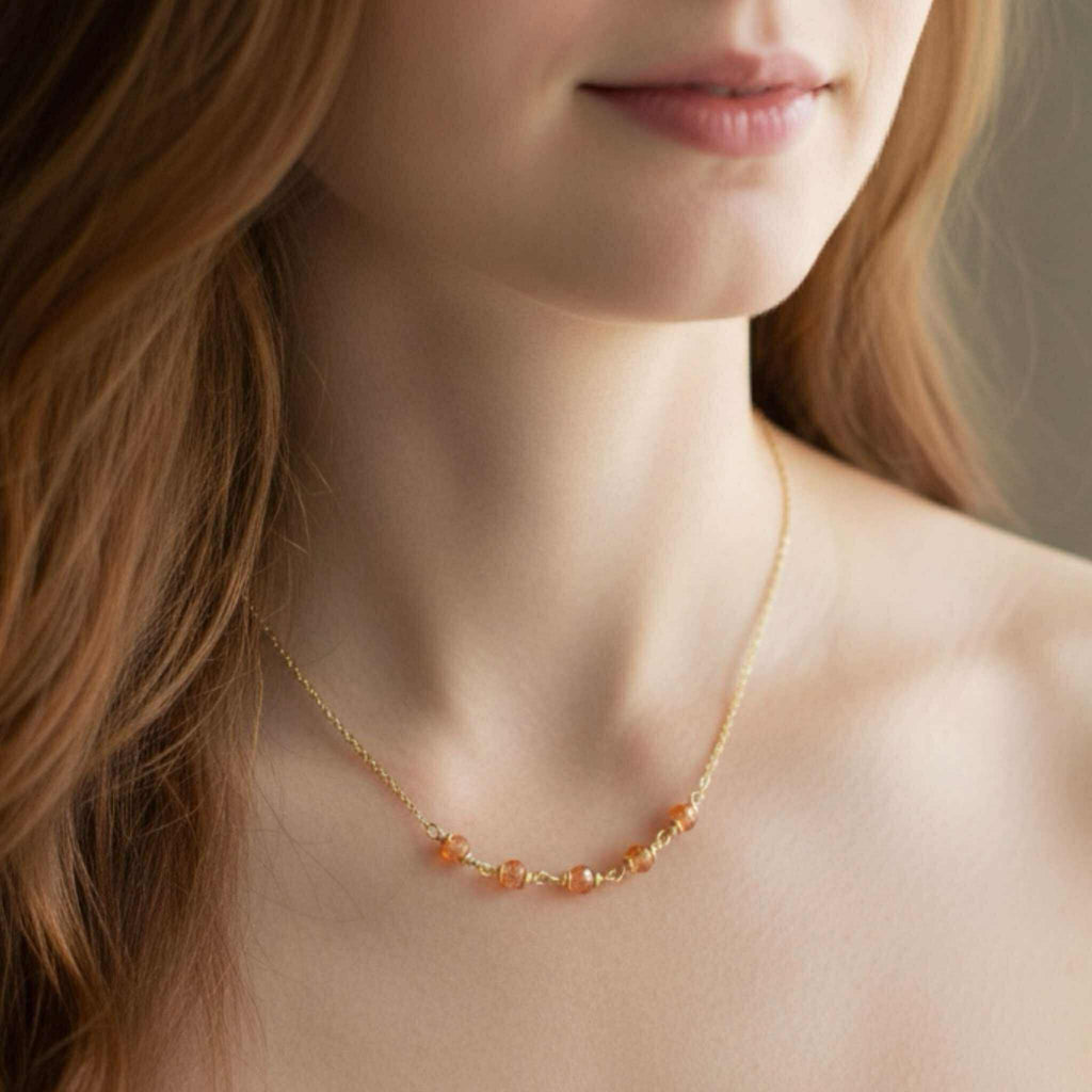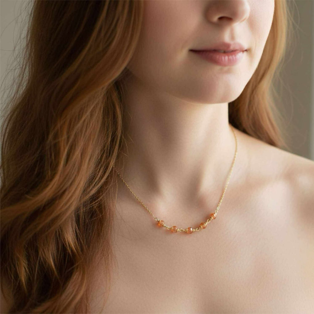 This dainty handmade necklace features 5 genuine Sunstone gemstones wrapped on a chain. This delicate choker necklace is beautiful worn alone or layered with other necklaces. A classic and simple everyday piece that will make fashion look effortless.